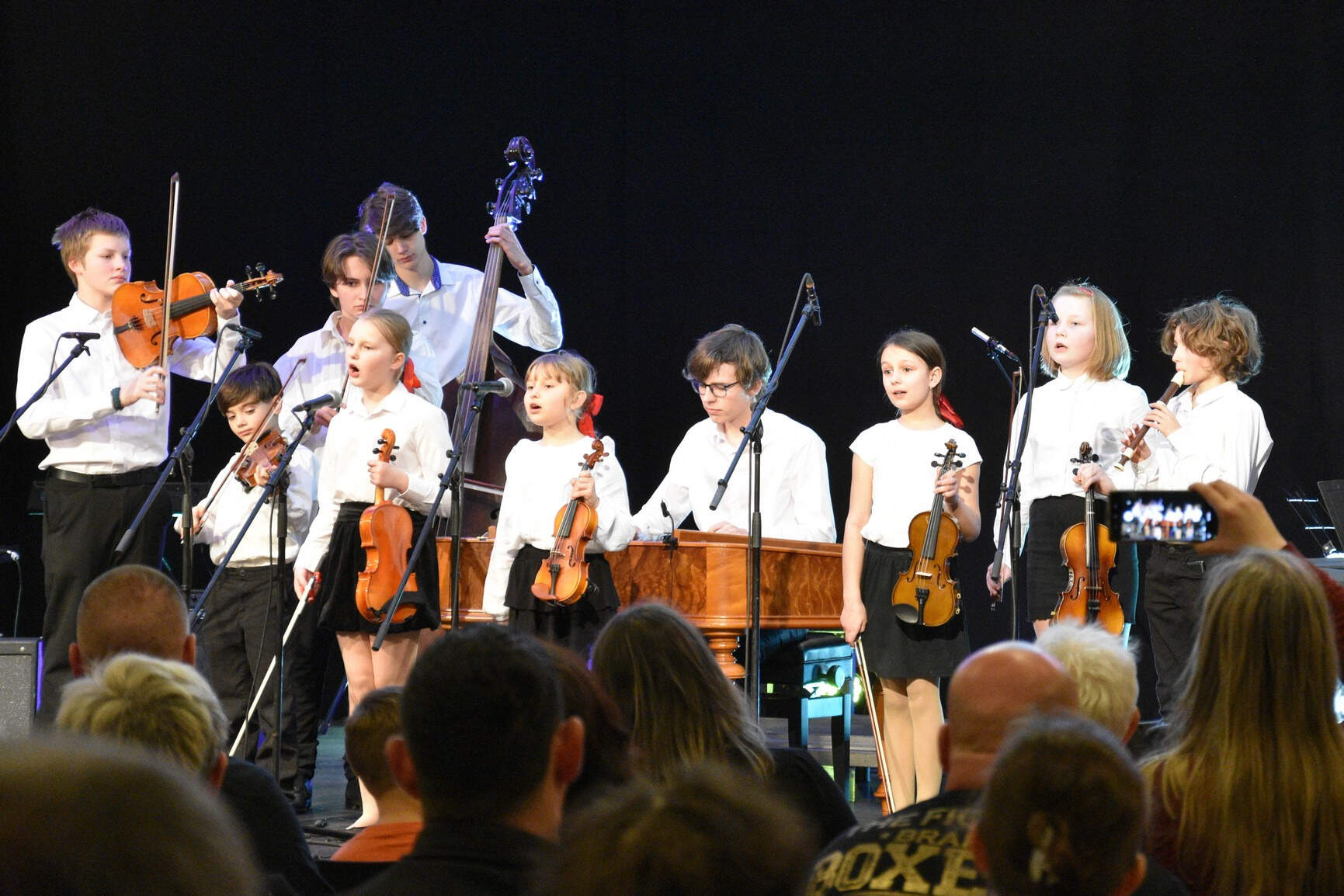 Na startovní pozici číslo jedna se představila kapela Nevym pod vedením pana učitele Jiřího Dokoupila, následovaná těsně souborem zobcových fléten paní učitelky Terezy Gavelčíkové. Jako třetí nastoupily na pódium naše „Adamušky“ – děti z mateřské školy Adamusova, které připravila paní učitelka Zuzana Jírů Šimůnková. Harfový soubor pod vedením p. uč. Kateřiny Havránkové přinesl zklidnění ještě posílené následujícím vystoupením kvarteta kytaristů pana učitele Dalibora Šlachty. Některé členky pěveckého sboru Koťata paní učitelky Zuzany Šimůnkové neváhaly vzít do rukou také hudební nástroje, zatímco jejich starší kolegyně ze sboru Liščata přišly na pomoc Kytarovému souboru pana učitele Standy Kvocha. Emoční vzepětí provázelo vystoupení souboru La Luna p. uč. Tatiany Pituchové, po kterém se představil pěvecký sbor Liščata vedený p. uč. Zuzanou Jírů Šimůnkovou svým samostatným vystoupením. To už se koncert blížil k závěru a na pódium nastoupila cimbálová muzika Šmidlíci, kterou připravil pan učitel Jiří Machač. Korunu celému, téměř dvouhodinovému hudebnímu zážitku nasadilo pěvecké vystoupení souboru Adamova banda pana učitele Adama Grygara.