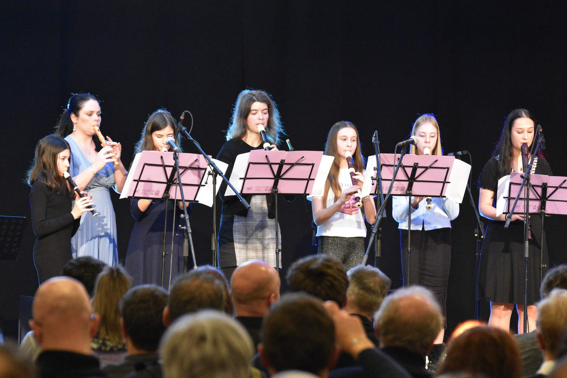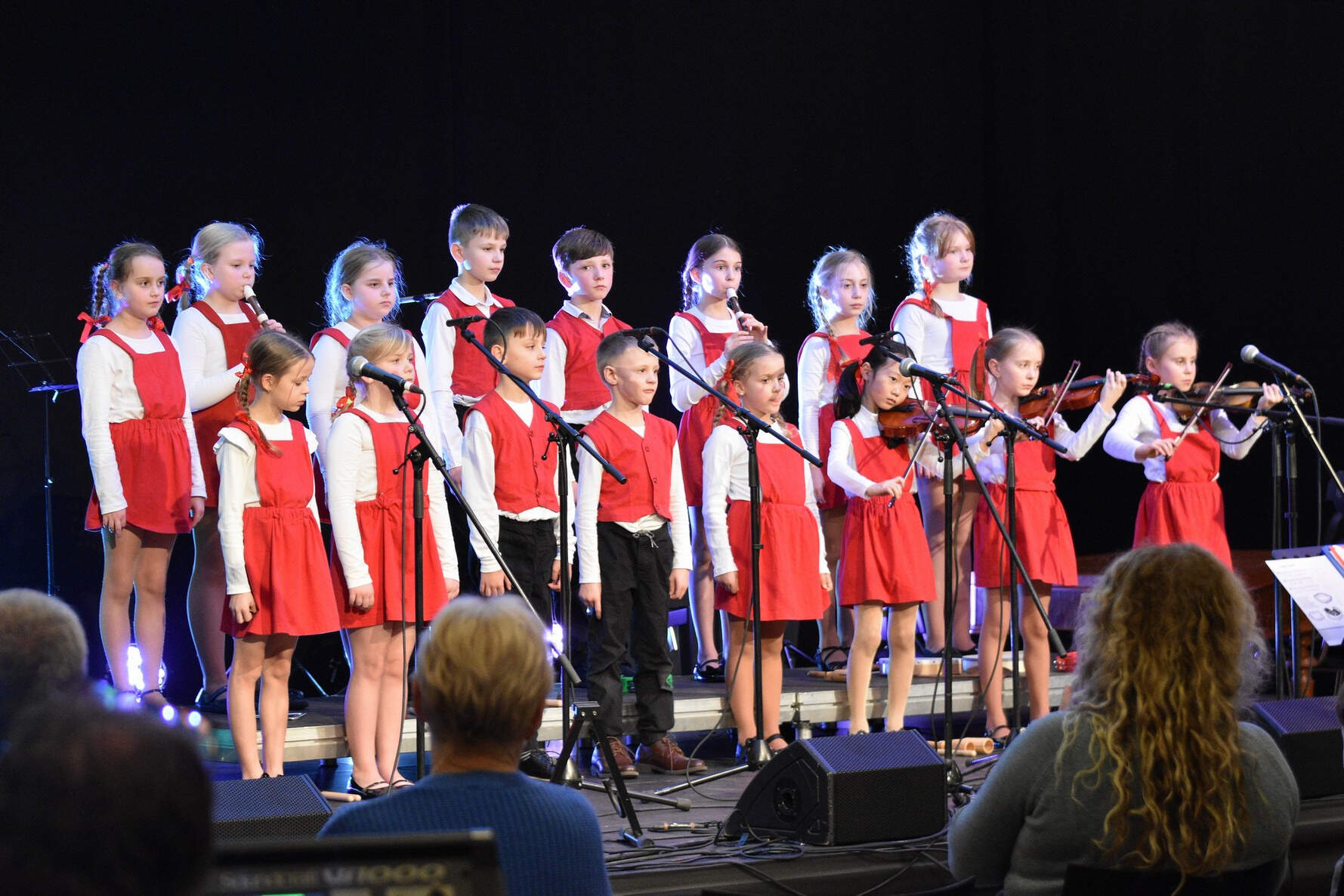 Na startovní pozici číslo jedna se představila kapela Nevym pod vedením pana učitele Jiřího Dokoupila, následovaná těsně souborem zobcových fléten paní učitelky Terezy Gavelčíkové. Jako třetí nastoupily na pódium naše „Adamušky“ – děti z mateřské školy Adamusova, které připravila paní učitelka Zuzana Jírů Šimůnková. Harfový soubor pod vedením p. uč. Kateřiny Havránkové přinesl zklidnění ještě posílené následujícím vystoupením kvarteta kytaristů pana učitele Dalibora Šlachty. Některé členky pěveckého sboru Koťata paní učitelky Zuzany Šimůnkové neváhaly vzít do rukou také hudební nástroje, zatímco jejich starší kolegyně ze sboru Liščata přišly na pomoc Kytarovému souboru pana učitele Standy Kvocha. Emoční vzepětí provázelo vystoupení souboru La Luna p. uč. Tatiany Pituchové, po kterém se představil pěvecký sbor Liščata vedený p. uč. Zuzanou Jírů Šimůnkovou svým samostatným vystoupením. To už se koncert blížil k závěru a na pódium nastoupila cimbálová muzika Šmidlíci, kterou připravil pan učitel Jiří Machač. Korunu celému, téměř dvouhodinovému hudebnímu zážitku nasadilo pěvecké vystoupení souboru Adamova banda pana učitele Adama Grygara.