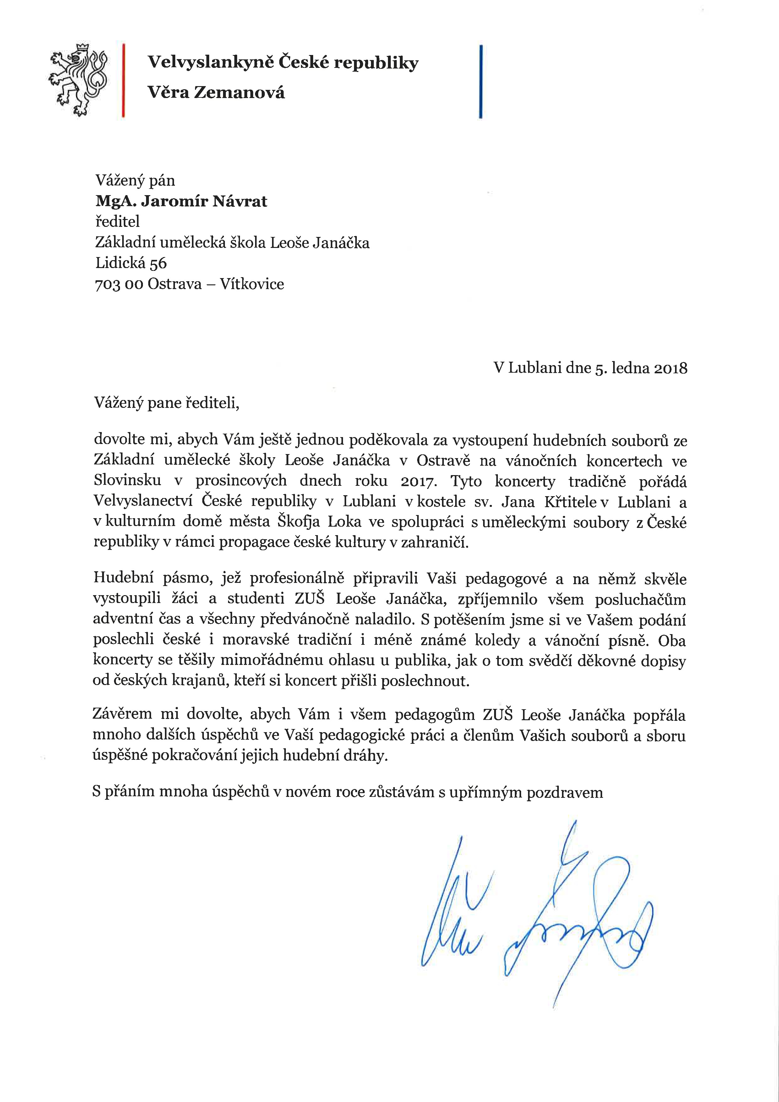 Úspěšný zájezd do Slovinska mají za sebou děti a učitelé naší Základní umělecké školy Leoše Janáčka v Ostravě-Vítkovicích. Spojené cimbálové muziky, soubor zobcových fléten a komorní pěvecký sbor vystoupily ve dnech 14. a 15. prosince na dvou koncertech pořádaných Velvyslanectvím České republiky v Lublani v kulturním domě města Škofja Loka a v kostele sv. Jana Křtitele v Lublani. Více než hodinový program složený ze známých a méně známých vánočních písní a skladeb se setkal v obou případech s vřelým ohlasem publika, jak uvádí mimo jiné i dopis s poděkováním od paní velvyslankyně České republiky v Lublani PhDr. Věry Zemanové.